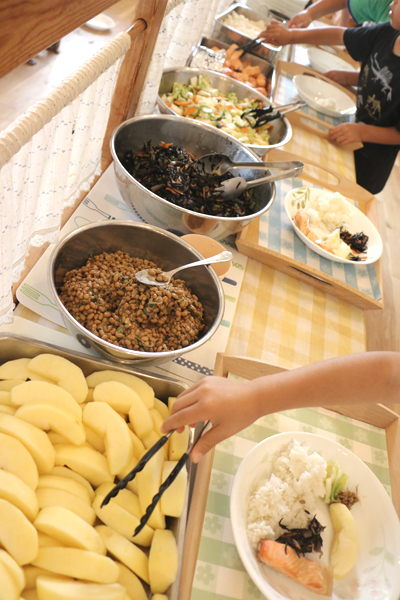 毎日みんなで作った味噌を天然昆布出汁に溶かし、そこへ沢山の具が入った栄養満点のお味噌汁、玄米・丸麦・白米がバランスよくおさまった、ほっかほかのごはんといった和食を軸とした献立を取り入れています。
