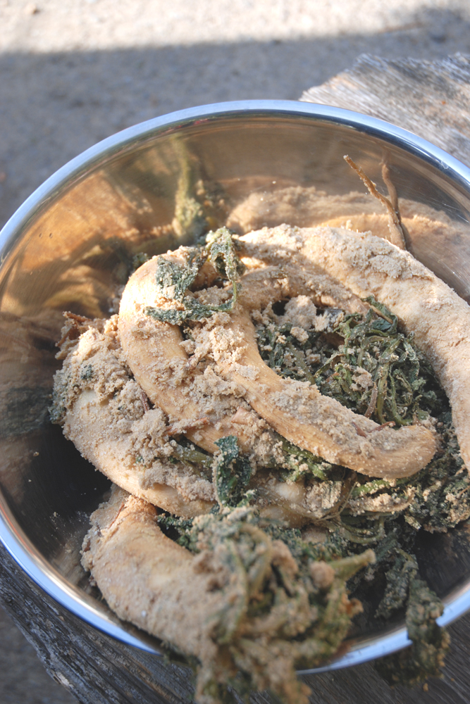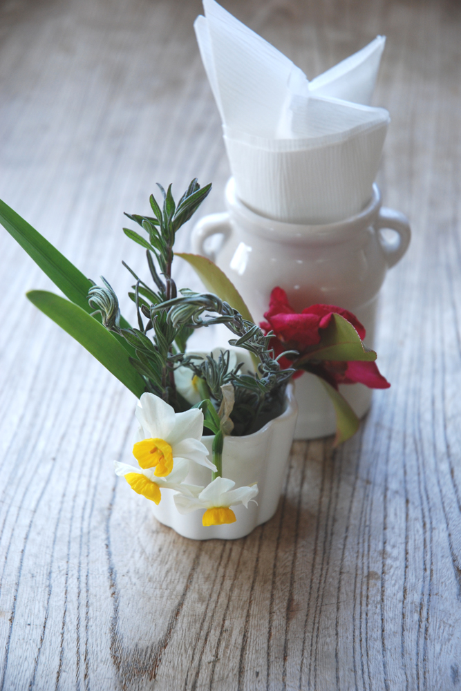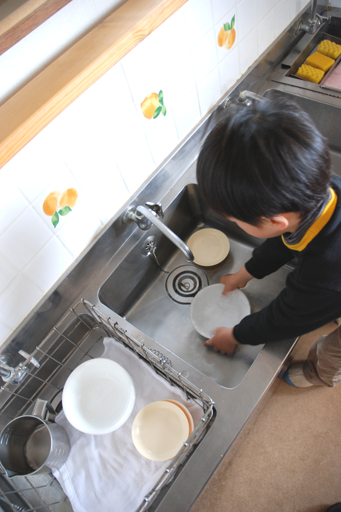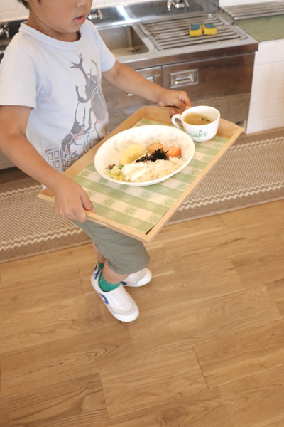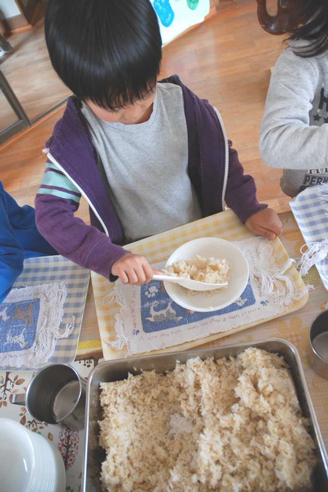 朝早く登園したこどもたちと野菜の皮むき、刻み、下ごしらえを一緒にします。春はつくし、夏はとうもろこし、秋はお芋、冬はダイコンやニンジンなど。形を楽しみ、皮をむき、香りをかぎ、刻んでかたさを知り、食べて味わう。季節の野菜を五感で感じることができます。そして庭に咲く花々を摘みテーブルに飾り、紙ナプキンを折り、準備すること、しつらえを楽しんでいます。